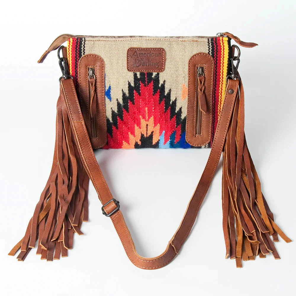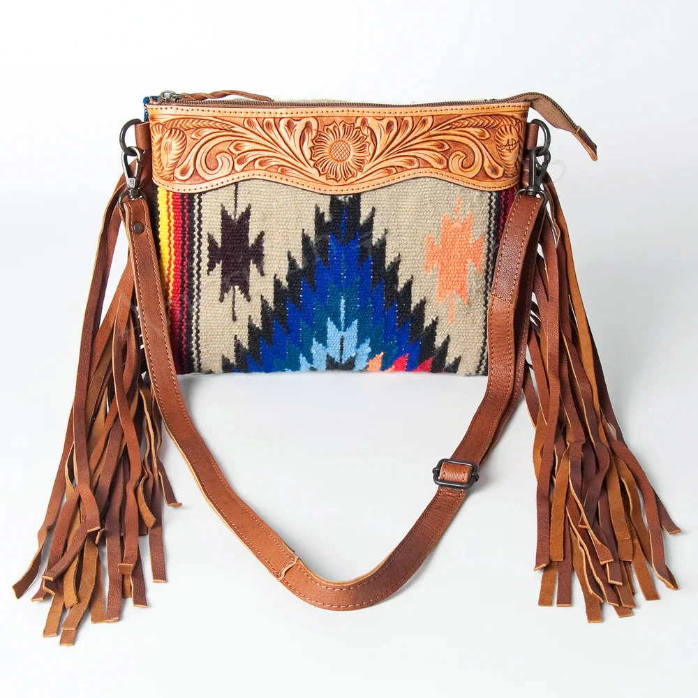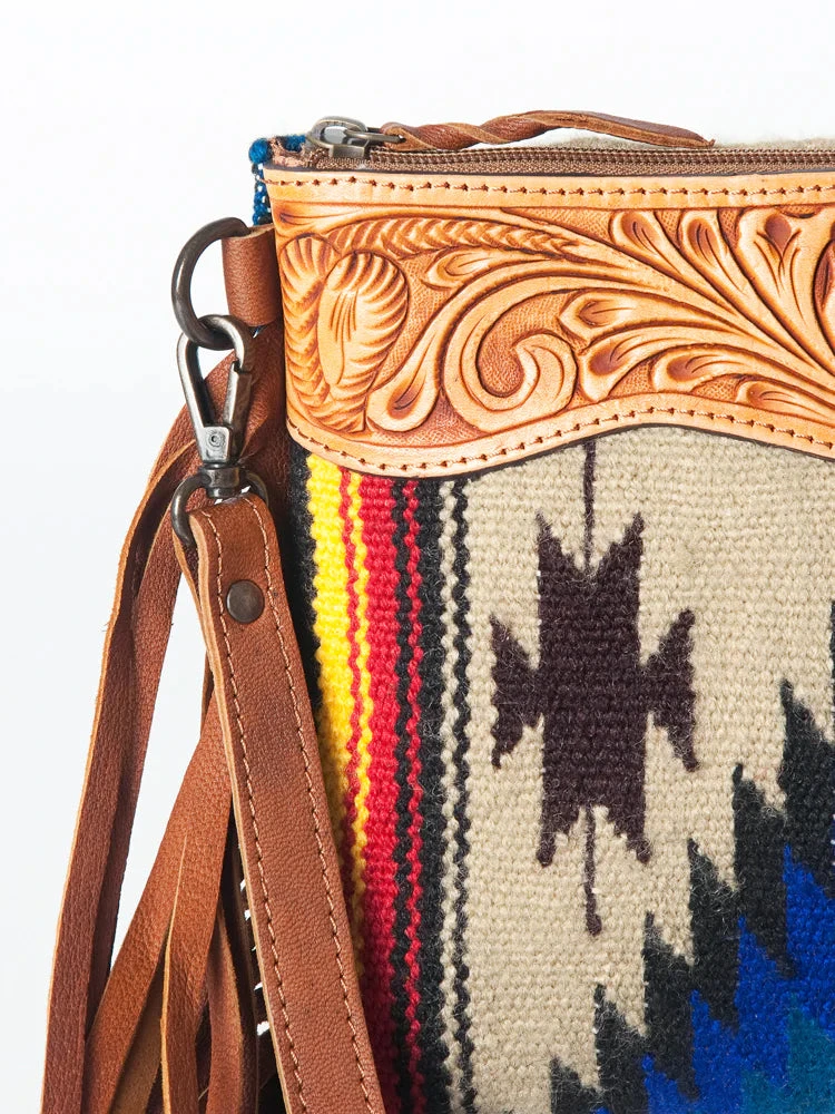 This cute little purse has tooled leather on the top with a fun Aztec pattern on the front and back!