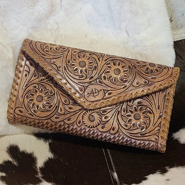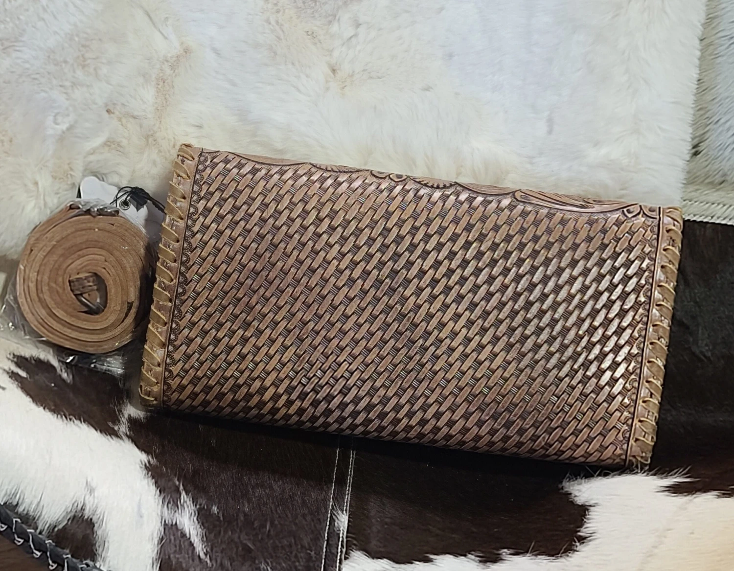 This large tooled clutch would dress up any outfit! It would be a great statement piece for the NFR. This clutch also comes with straps, you can turn this clutch into a purse.
