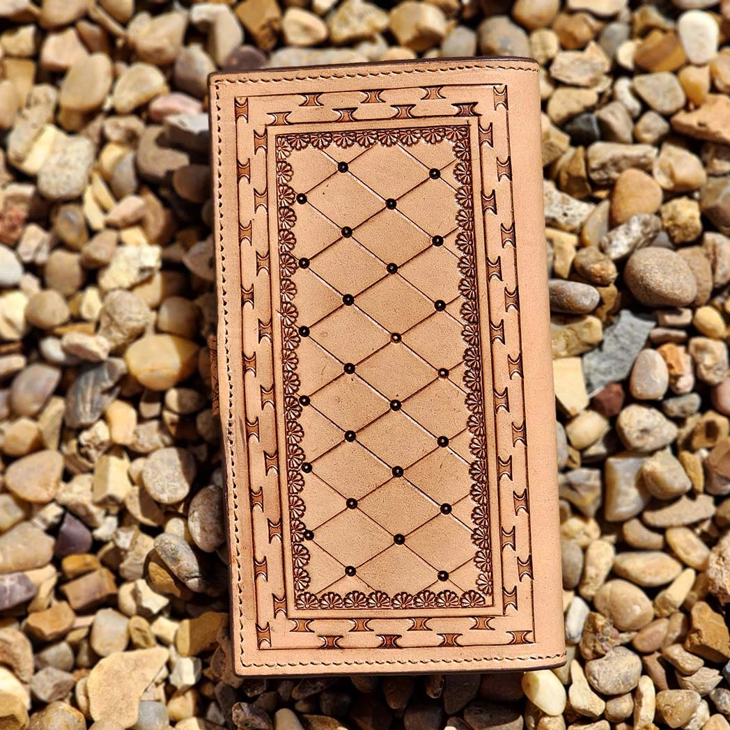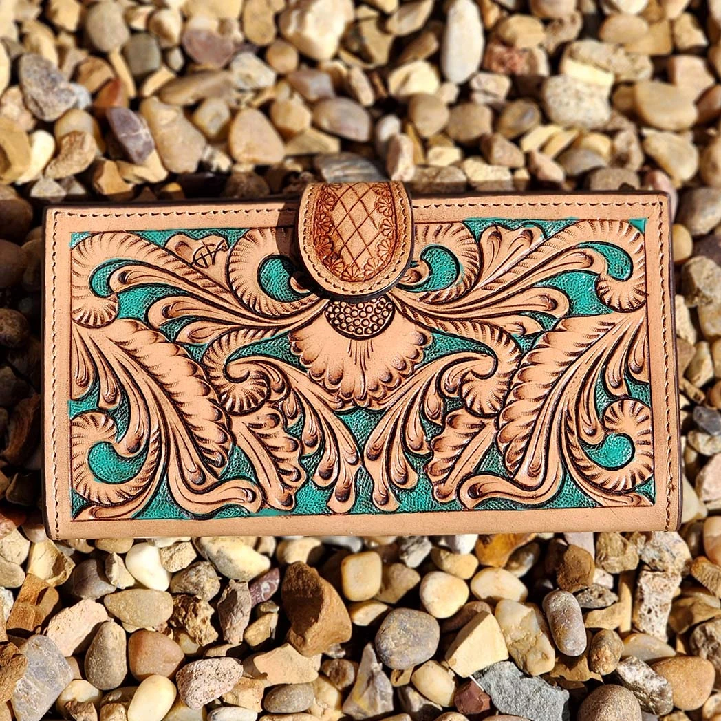 This stunning Tooled leather wallet has a turquoise accent that just makes this whole wallet pop! Plenty of places for your credit cards and more.