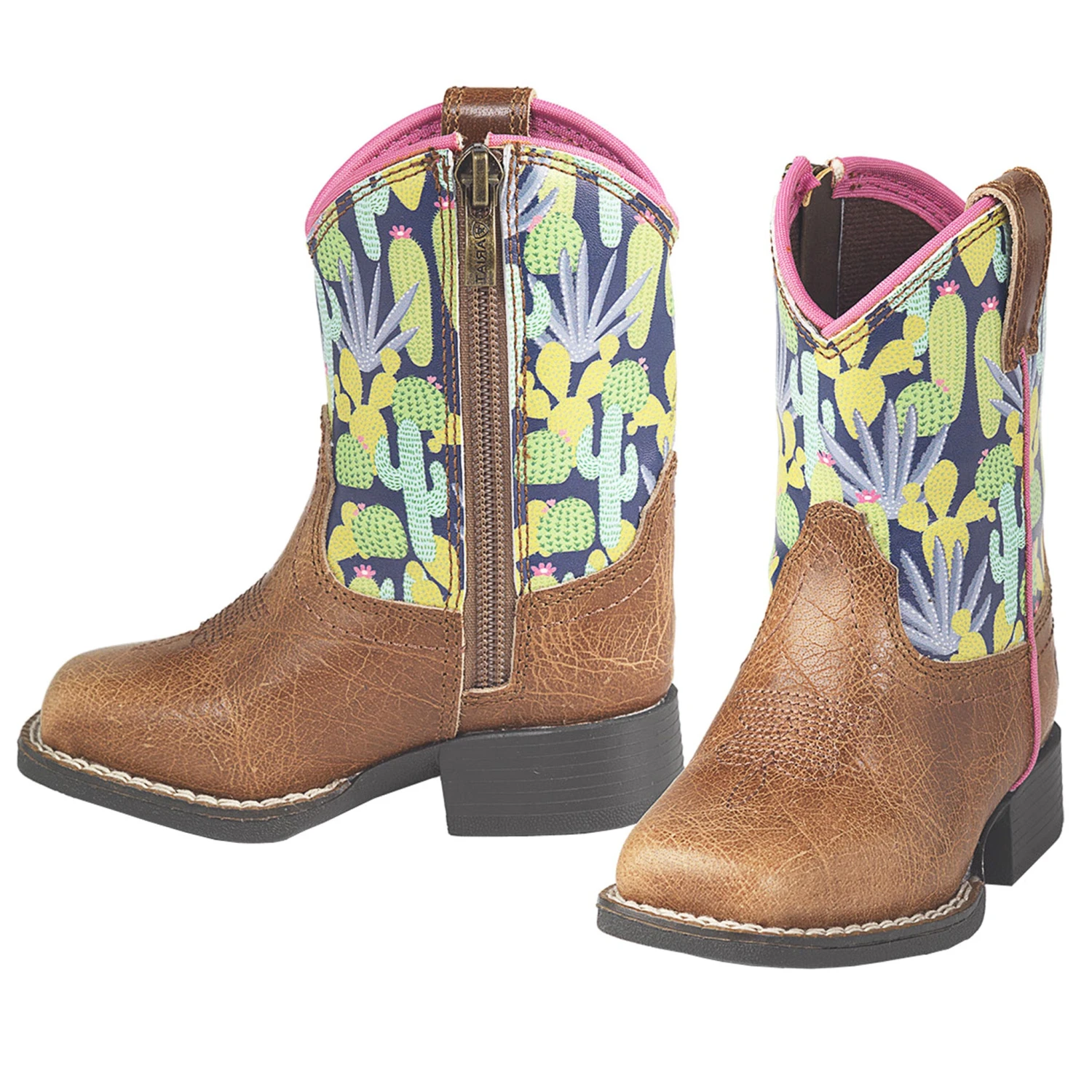 Dress em up in style with these Ariat Lil’ Stompers boot. Genuine leather vamp with a colorful cactus shaft. Leather boot pulls.
