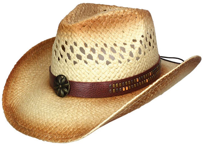 This ladies fashion straw hat is perfect for any women. The crown is vented and is tea stained. Around the crown is a brown piece of leather with tiny metal pieces and a metal stud that includes are flower concho.