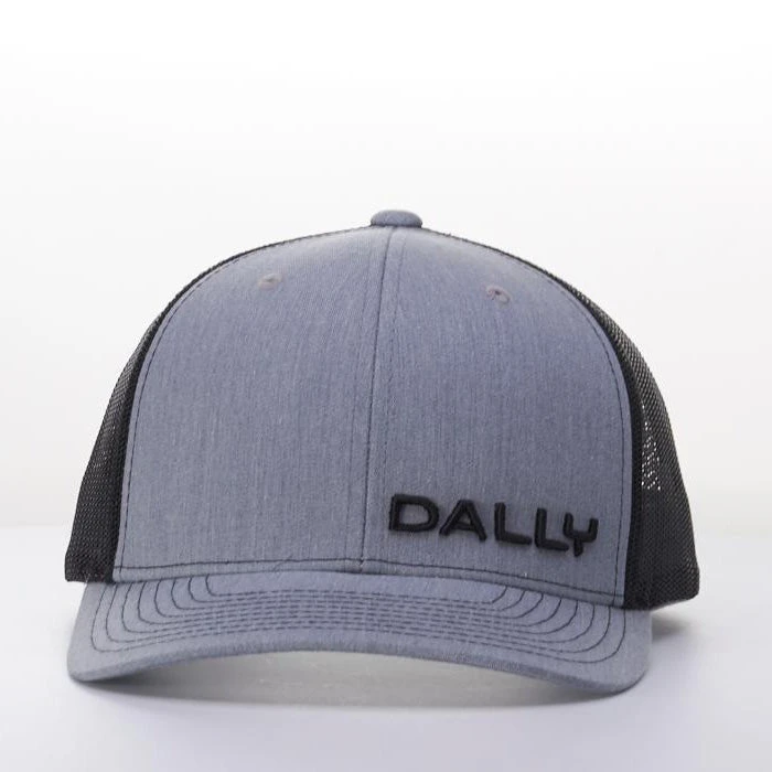 This cap from Dally Up has a grey front with black lettering that reads “DALLY” in the lower right hand corner. The back is black and made of mesh. Also has an adjustable snap closure in the back.