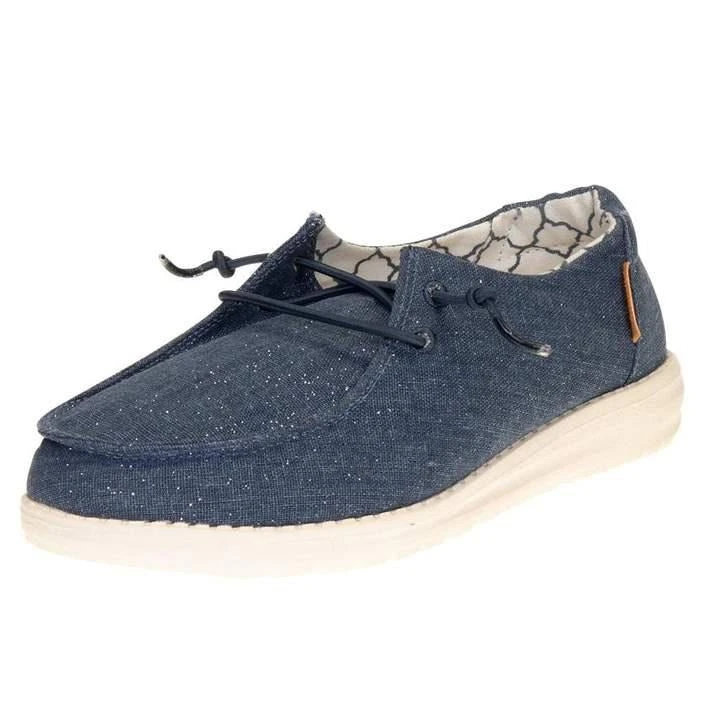 These youth Hey Dude shoes are a fun sparkly blue denim! The color is perfect to match with any outfit and you’ll love the comfort even more! The shoes have a soft cork insole and a rubber outsole!