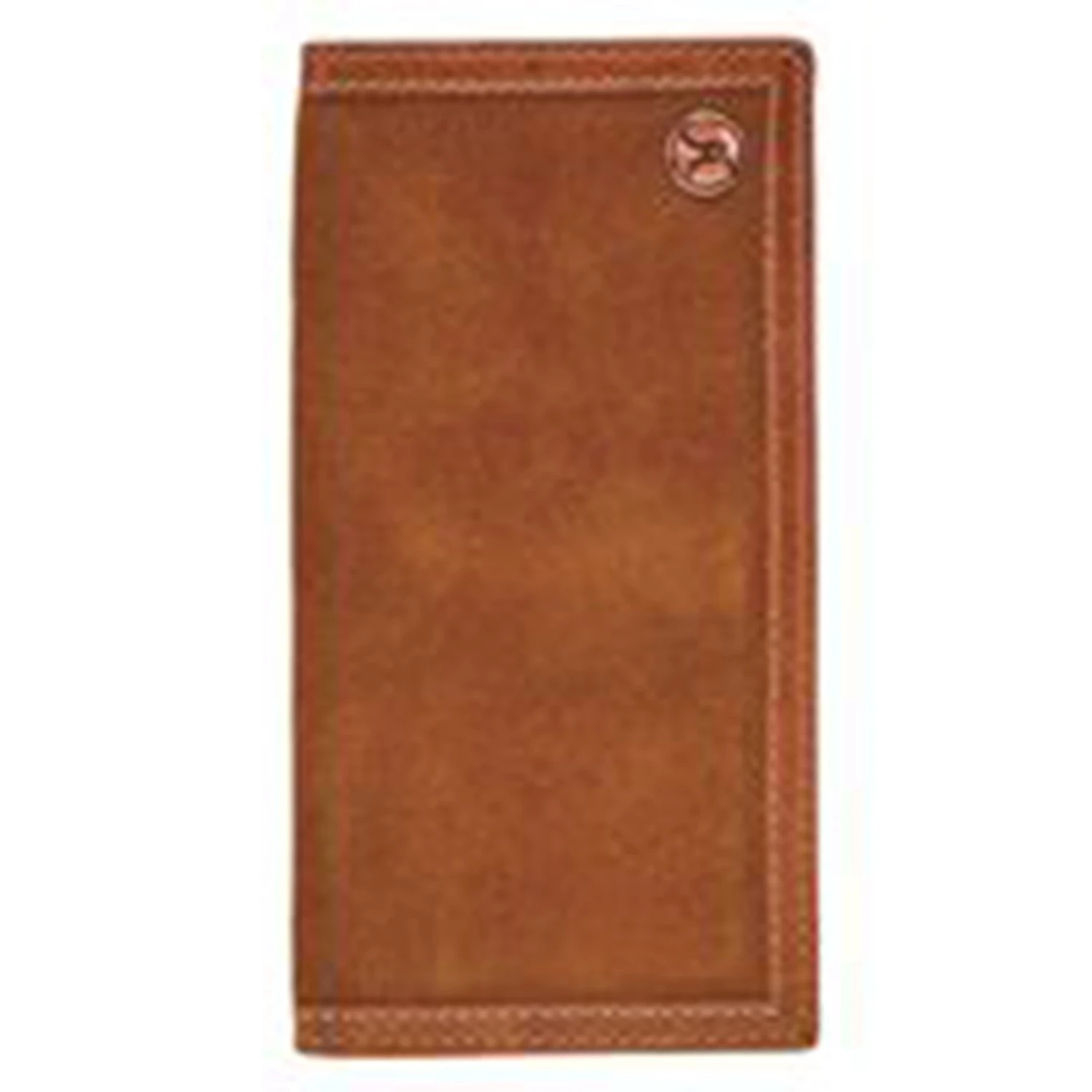 This genuine leather roughout wallet has a brown leather double welt edge and a Hooey logo rivet. There is plenty of room for your checkbook, credit cards, cash and ID. On the back cover there is a black Roughy logo.