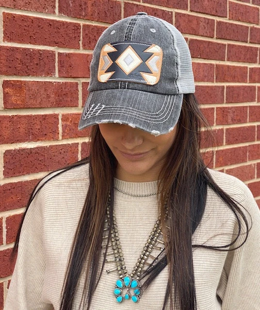 A lightly distressed charcoal cap featuring a black/white/silver hand painted leather patch.