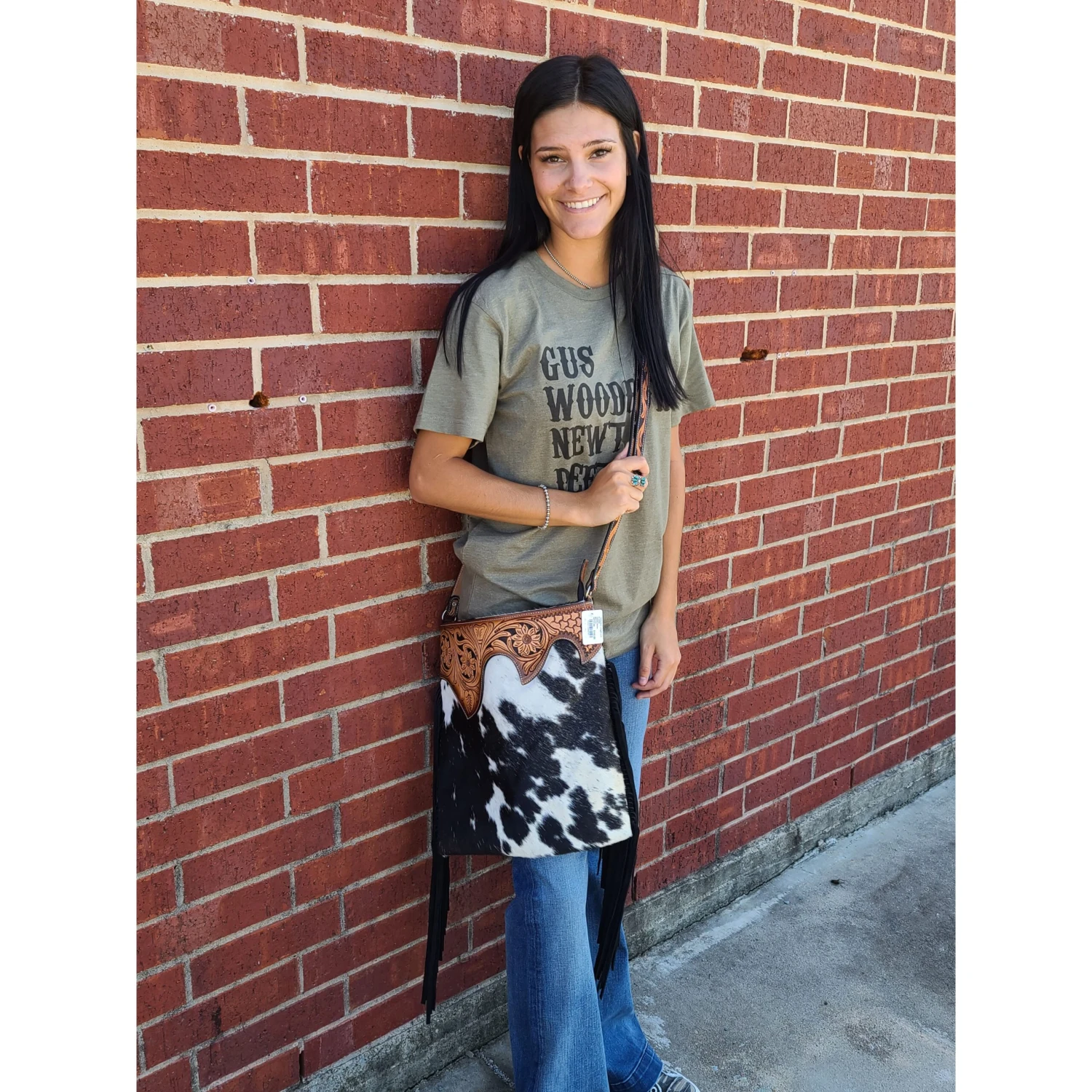 Such a cute Black and white cowhide purse. Wear it as a crossbody or shoulder bag. Black fringe and tooled leather complete this cute beautiful detailed purse.