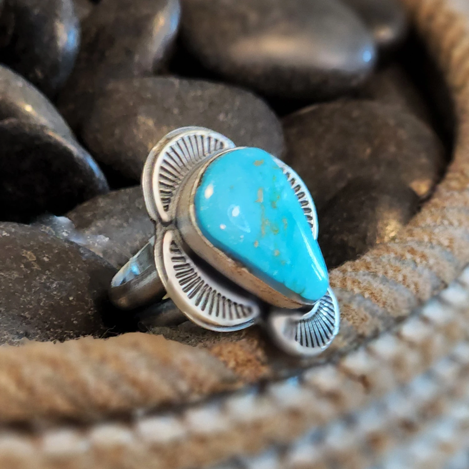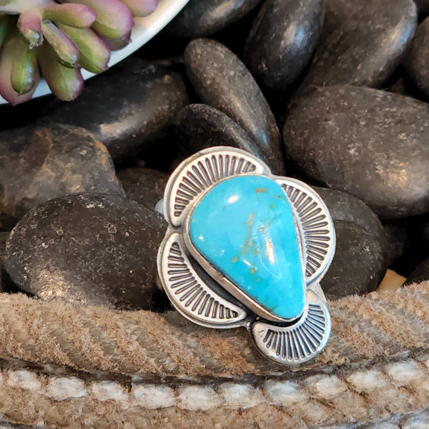 This stunning Kingman turquoise ring is a show piece. From the stunning color to the beautiful silver work you will love everything about this beauty.