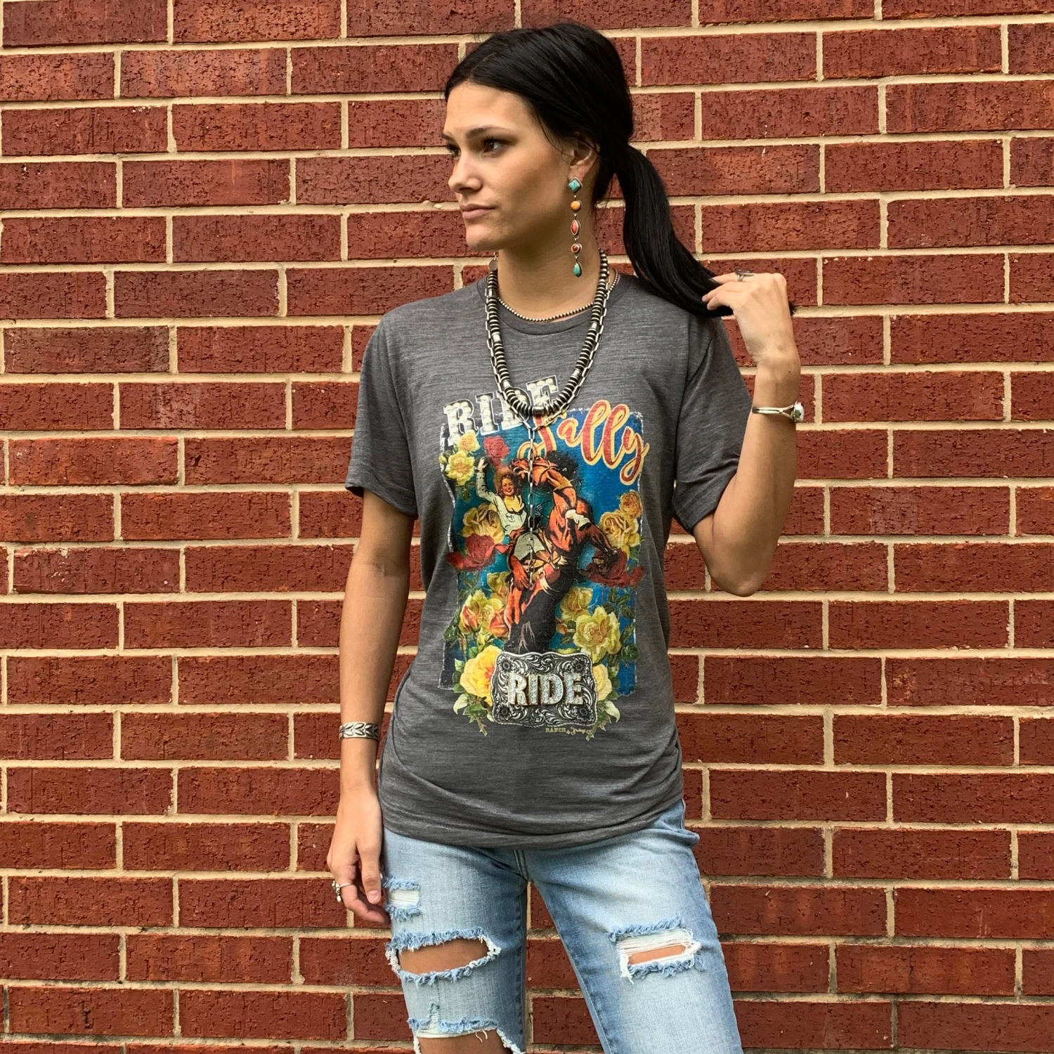 Dress this tee up for a night on the town or simply pair it with your favorite shorts and be cute either way. Ride Sally Ride ………..