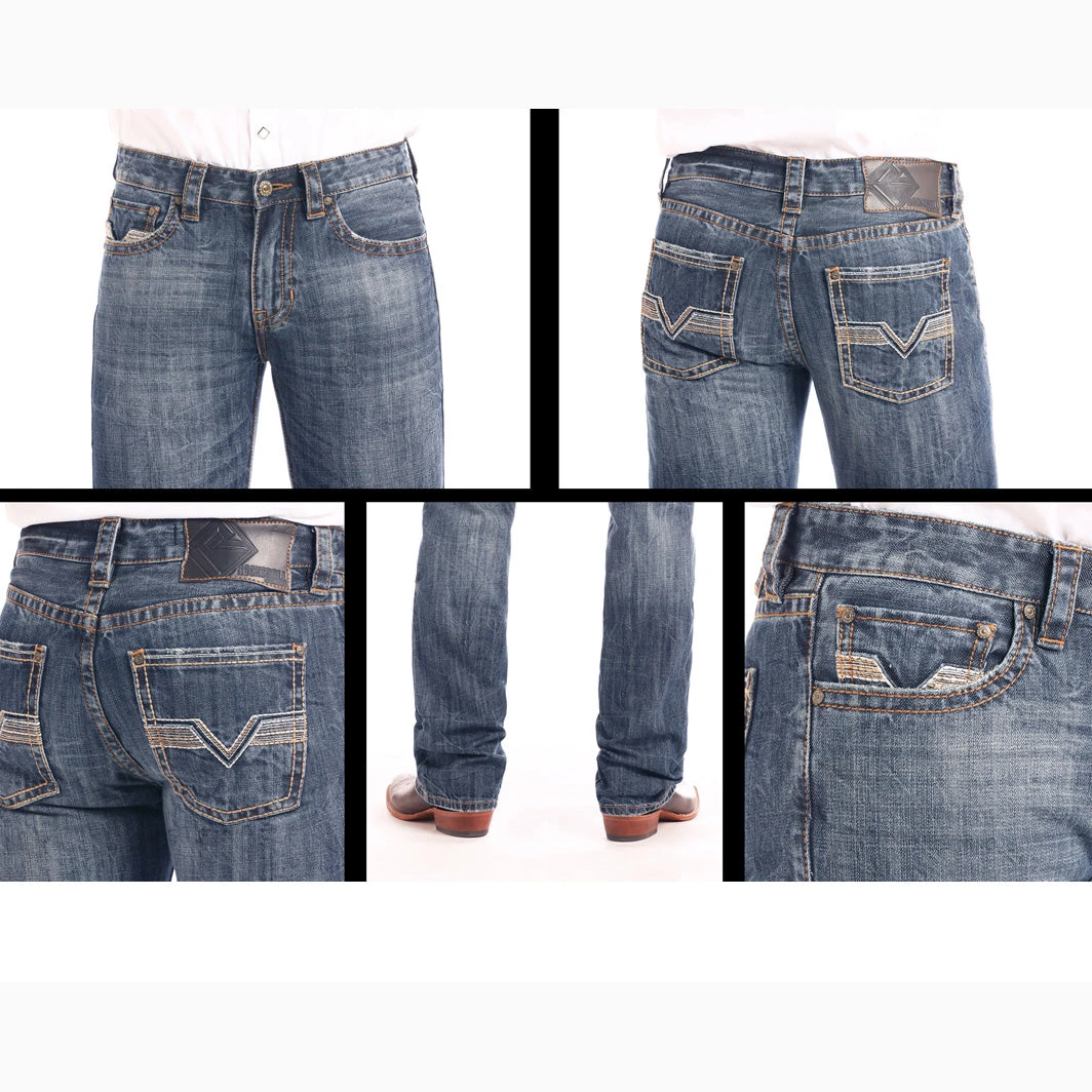 These men’s jeans from Rock & Roll Cowboy feature a medium distressed wash with a straight leg opening at the bottom! The back pockets feature a vintage V with different colored stitching!