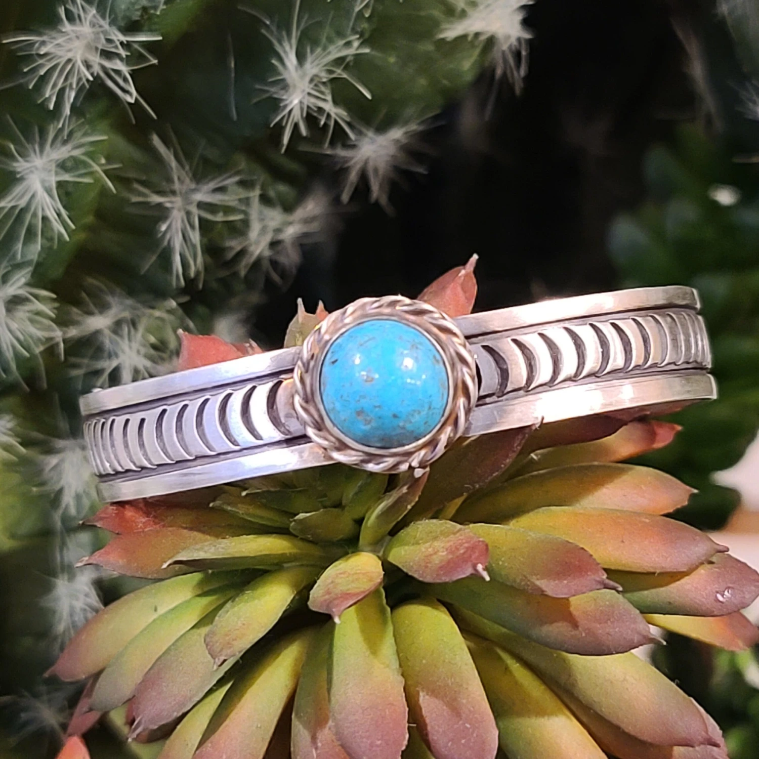 This is a beautiful Kingman Turquoise stone in this cuff. The Added detail in the silver is a great touch with the rope pattern around the stone. There is a little adjustability in this cuff to fit your wrist better.