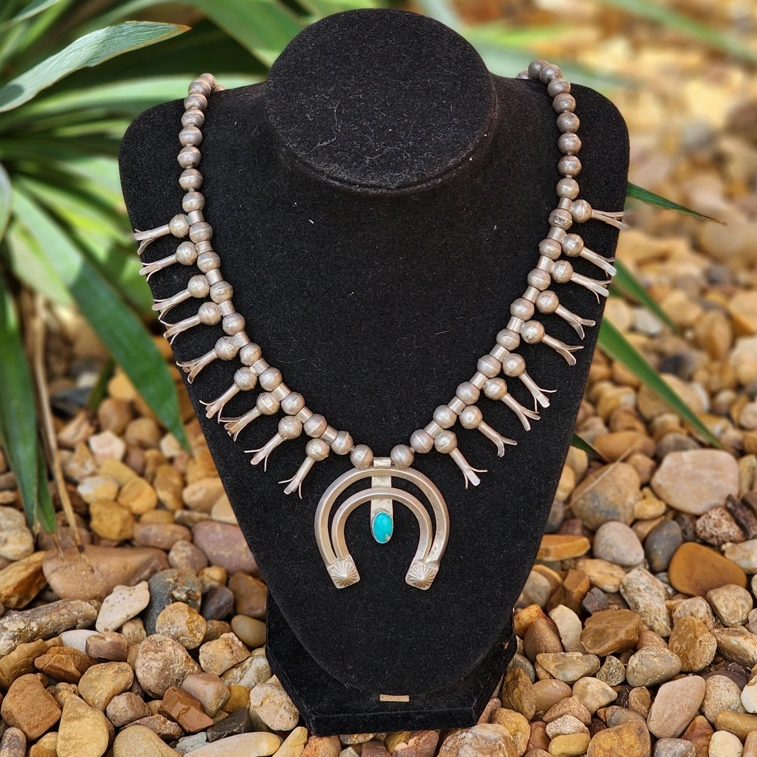 If you are looking for a vintage piece for your collection look no further. This 1940’s squash blossom is perfection. The 1 turquoise stone is all this piece needs. The blossoms and beads are stunning.